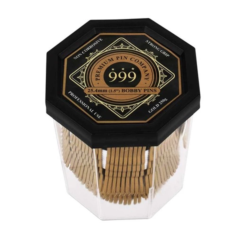 Premium bobby pins with ultra-strong grip. From day into night, Premium Pin Company 999 Bobby Pins support any updo. These secure hold bobby pins are long-lasting, non-corrosive and designed for professional use. From dramatic evening updos to casual everyday styles, Premium Pin Company 999 Bobby Pins work for all hair types.