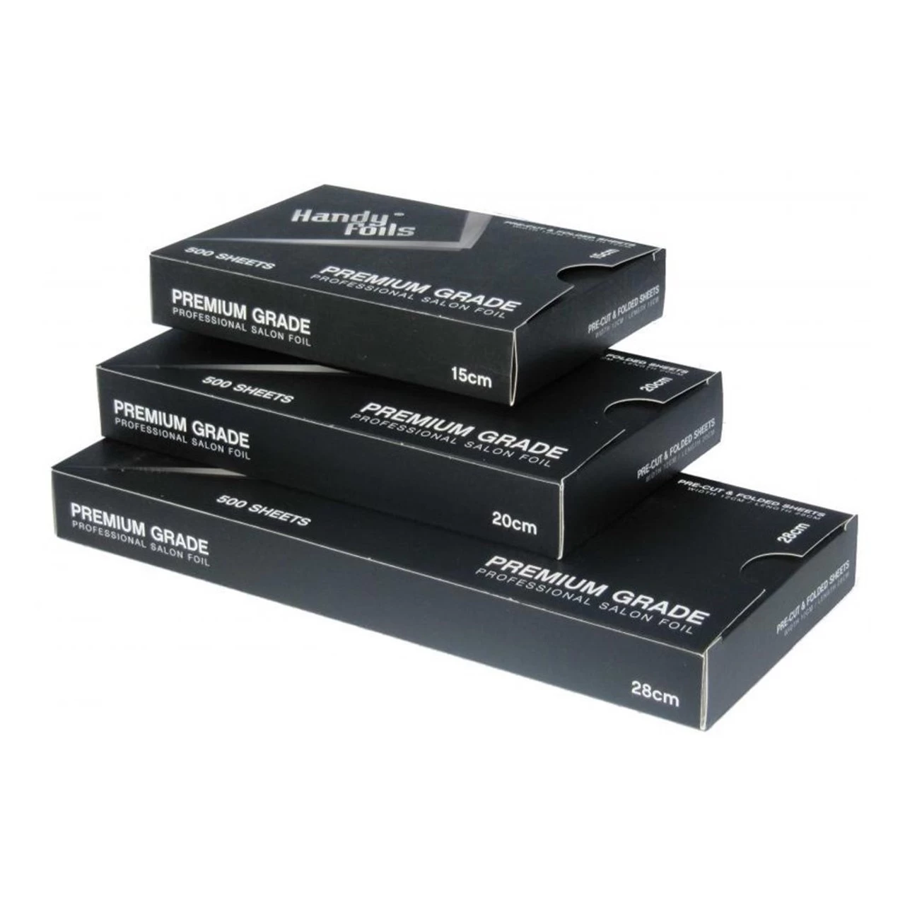 Handy Foils professional hairdressing foil is available in rolls and pre-cut sheets and comes in 3 thicknesses/grades. Premium Grade (20 micron) is for those who like the thickest & strongest foil in the range, Heavy Duty (18 micron) is for colourists who prefer a slightly thinner feel, & Light Grade (15 micron) is the thinnest & lightest in the range. ​All 3 grades have the unique “soft touch” feel that Handy Foils is renowned for.