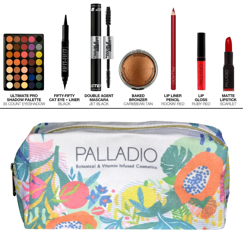 Recreate our Bombshell makeup look with these exclusive Palladio Beauty Products! The Bombshell Makeup collection was created for those looking for bold beauty with a sexy bronze eye and a ruby red lip. This gift set includes a one of a kind, travel-sized makeup bag. This set includes: