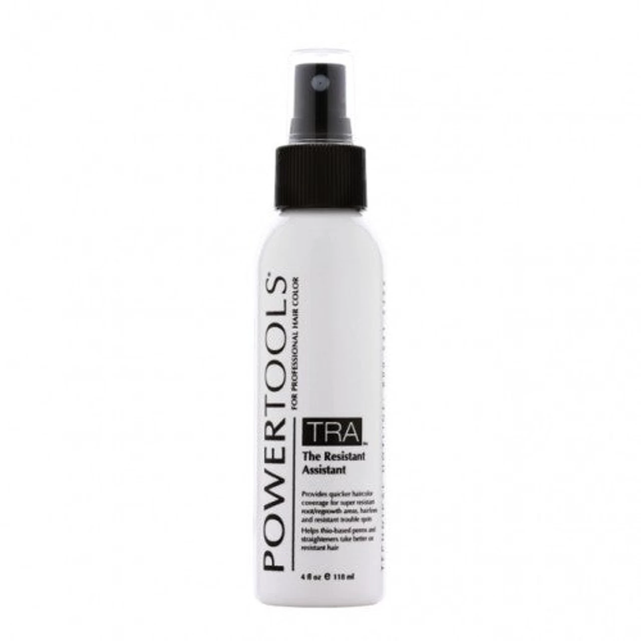 TRA, The Resistant Assistant, is a three minute pre-softener that deposits hair color quicker on super resistant hairlines, trouble spots and whole resistant heads. TRA can be used with any manufacturers, color/chemical lines and is perfect with permanent, semi-permanent, demi-permanent color. TRA can also be applied before wrapping perms to soften resistant areas. TRA on coarse hair prior to straightening to help breakdown the curl/wave faster. TRA works in combination with all POWERTOOLS products.