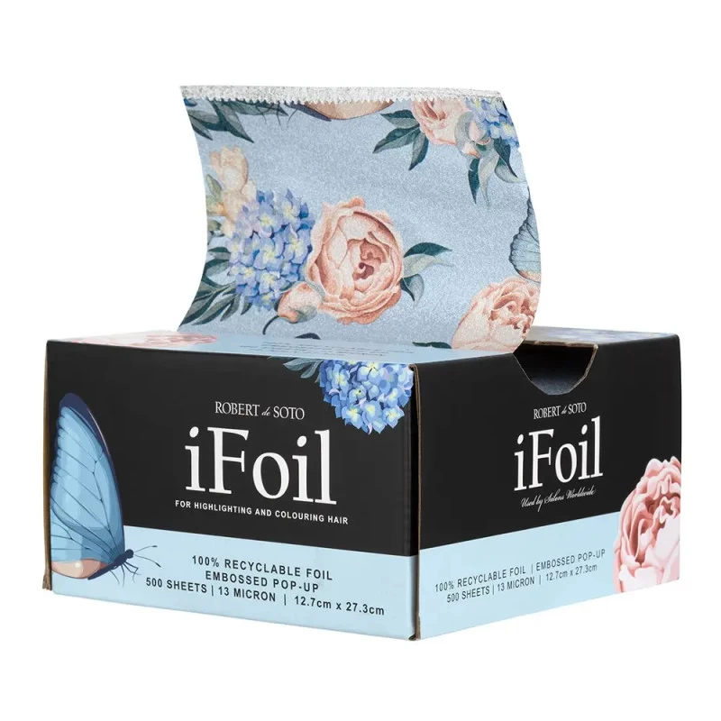 Add a little fun to your salon style! Great for all colouring services, this patterned Robert de Soto iFoil Embossed Pop Up Butterfly is foil with flair. With 100% recyclable foil , each box contains a generous 500 sheets and features a small push-up action underneath for convenience when foil is running low. No cutting, no hassle – each sheet measures 12.7cm x 27.3cm, the standard size for highlighting and colouring. The easy pop-up dispenser makes life easier, while the embossed foil’s much needed grip prevents slippage