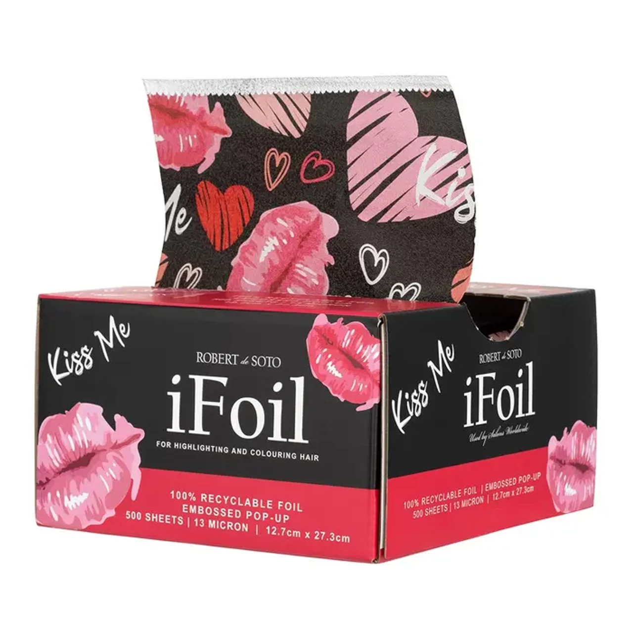 Add a little fun to your salon style! Great for all colouring services, this patterned Robert de Soto iFoil Embossed Pop Up Kiss Me is foil with flair. With 100% recyclable foil , each box contains a generous 500 sheets and features a push-up action underneath for convenience when foil is running low. No cutting, no hassle – each sheet measures 12.5cm x 27.3cm, the standard size for highlighting and colouring. The easy pop-up dispenser makes life easier, while the embossed foil’s much needed grip prevents slippage.